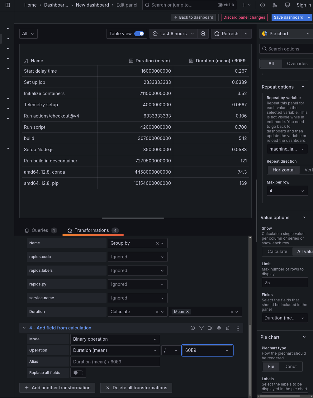 - After a group-by aggregation, Grafana can lose track of the duration in terms of nanoseconds. To compensate for this, add an “Add field from calculation” transformation. You can divide nanoseconds by 60E9 to obtain minutes. Keep in mind that this is adding a new column, not altering the old one. You’ll need to select the new column in the “Value options -> Fields” combobox.